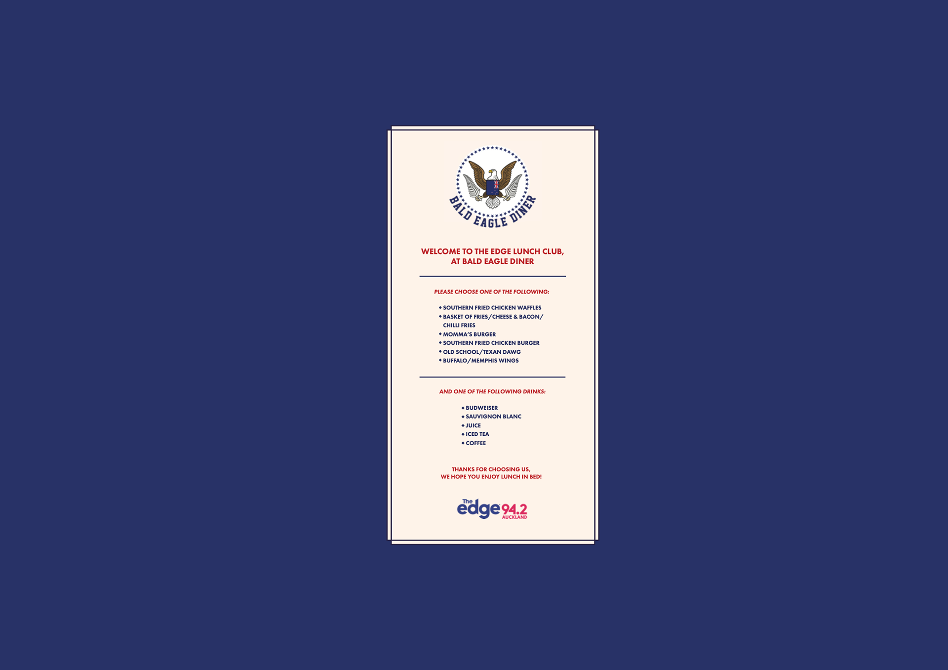 Menu designed for an exclusive event at Bald Eagle Diner - Auckland, New Zealand.
